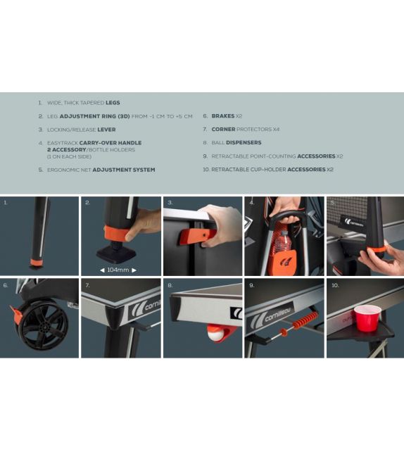De Rolls onder de vrijetijdstafels De SPORT 500 OUTDOOR zal door buren met bewondering worden onthaald. De tafel beschikt over alle troeven van een Cornilleau: esthetiek, veiligheid, betrouwbaarheid, ergonomie, maar ook sterkte en weerbestendigheid.